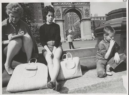 The original photograph was captured in May 1959—just a month before my own birth—by Angelo Rizzuto, a street photographer from New York City. In my artistic process, I treat the photo as a starting point to develop a broader narrative. For this piece, I removed the figure positioned in the middle ground, cropped out the boy on her right, and erased the woman taking notes. My intention was to make her the focal point of the story.