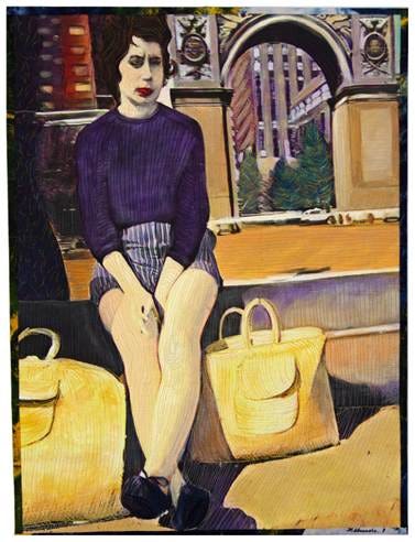 Beside the woman lie two woven shopping bags reminiscent of the late 1950s, grounding the scene in a specific era and adding to the narrative of everyday life. In the background, an arch frames the tall city buildings, creating a sense of structure and distance. Beyond the arch, a street runs through the scene, and a tree casts shade nearby. The overall composition conveys the young woman’s exhaustion, capturing a moment of pause and vulnerability within the bustling city environment.